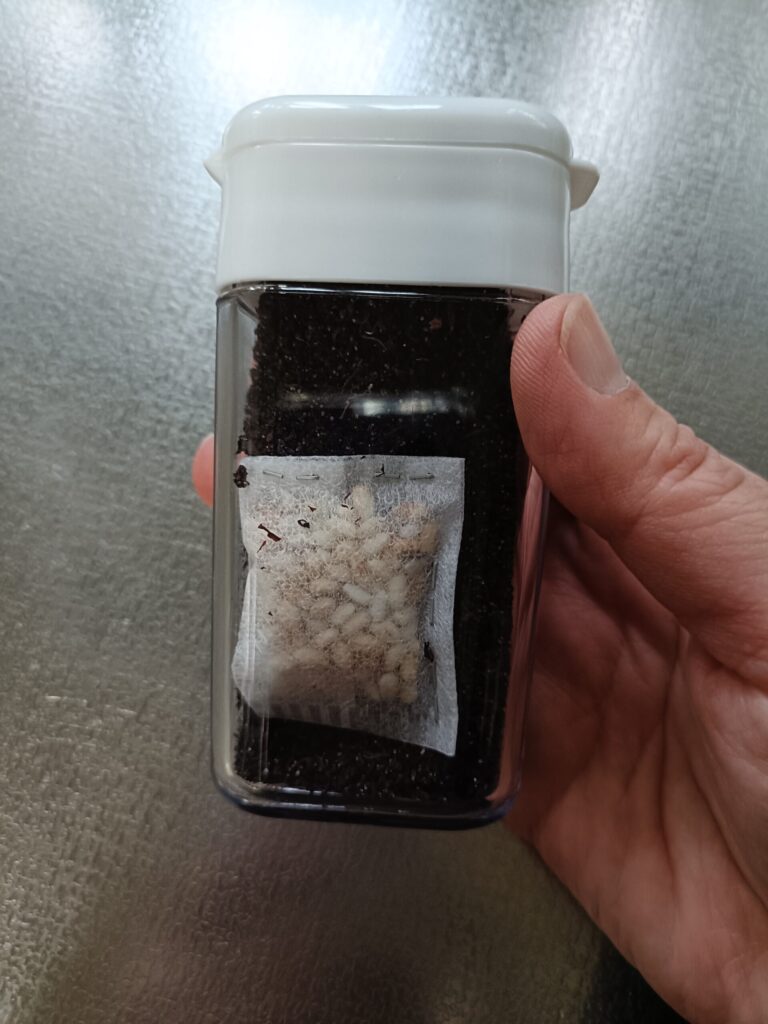- お茶パックを容器に合わせて小さくカットし、乾燥したお米を入れたら開口部をホチキスで止める