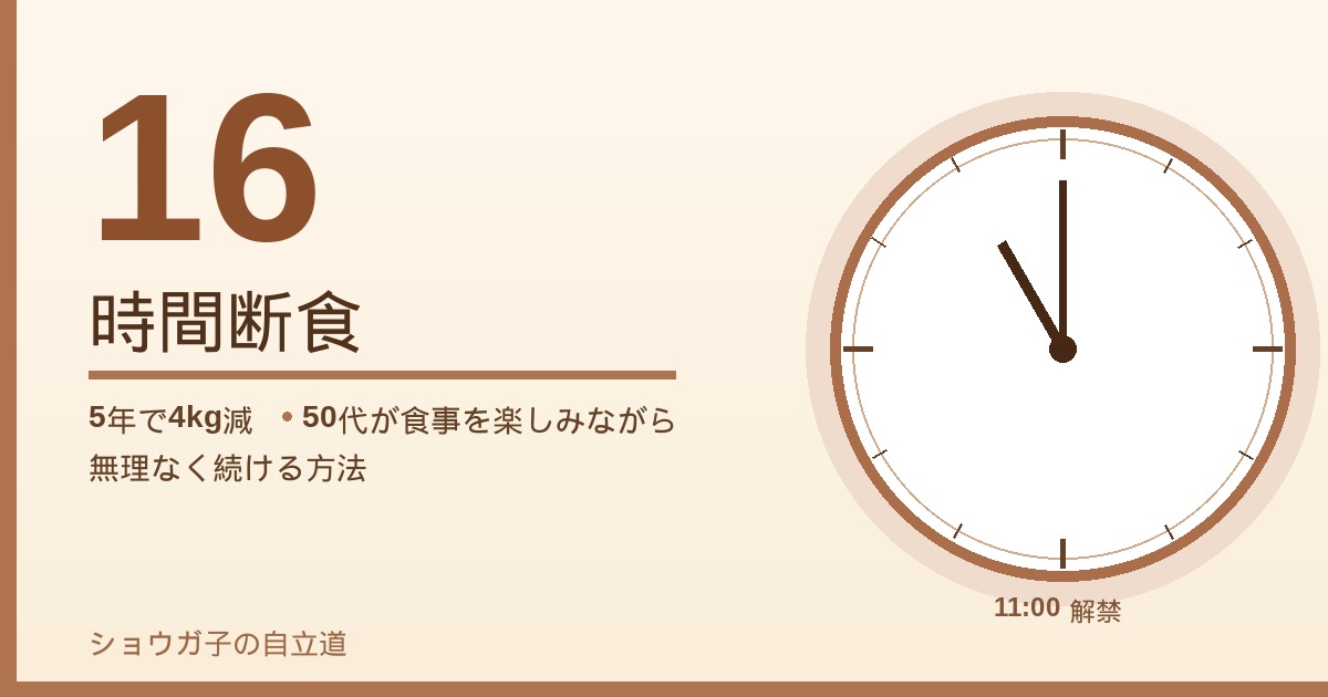 16時間断食を5年続けて、体重は54.5kgから50kgになりました。でも正直、数字よりも「食べることが楽しくなった」ことが一番の変化です。